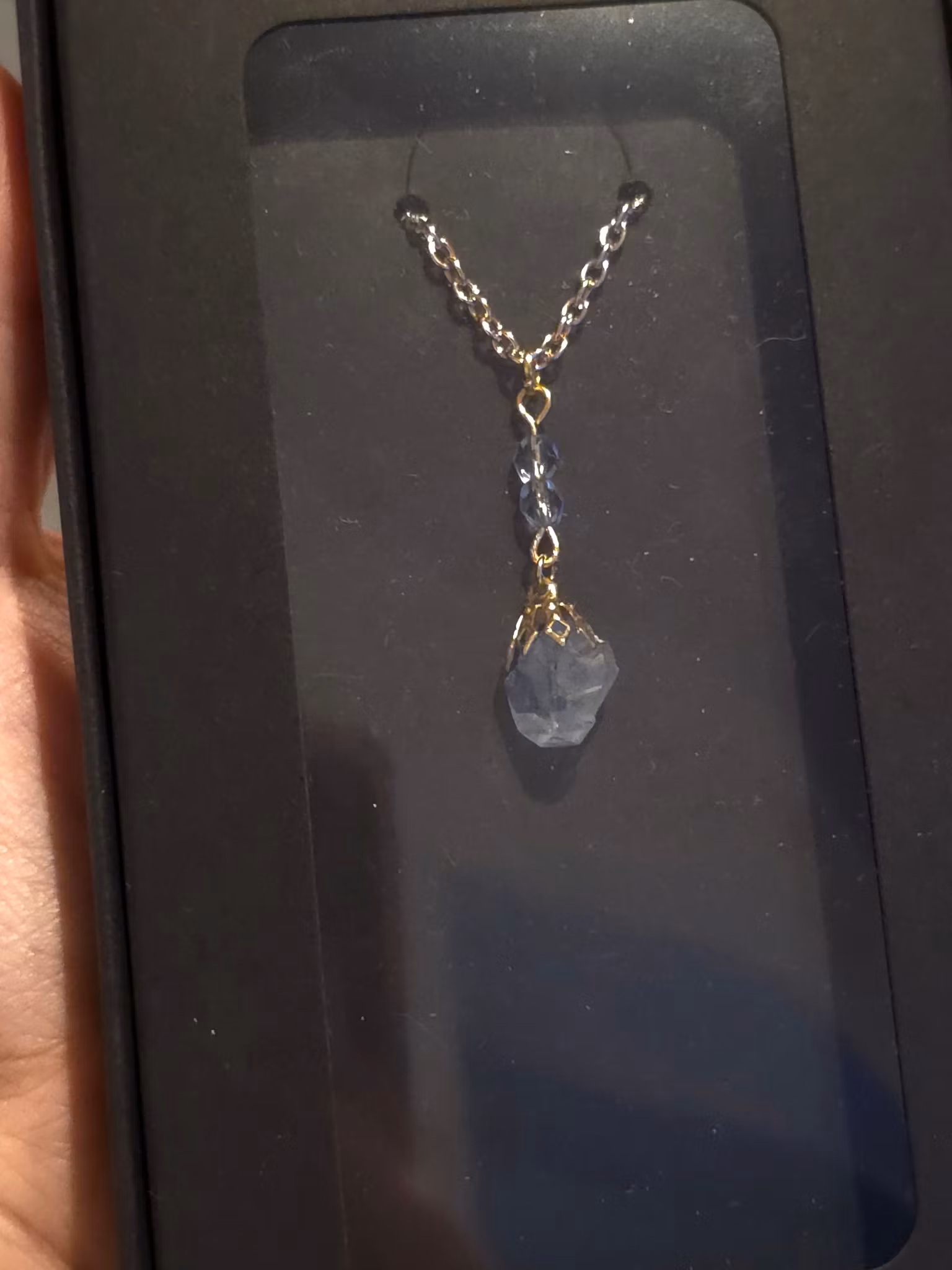 Ljusblåa små pärlor och guldfärgade detaljer.
