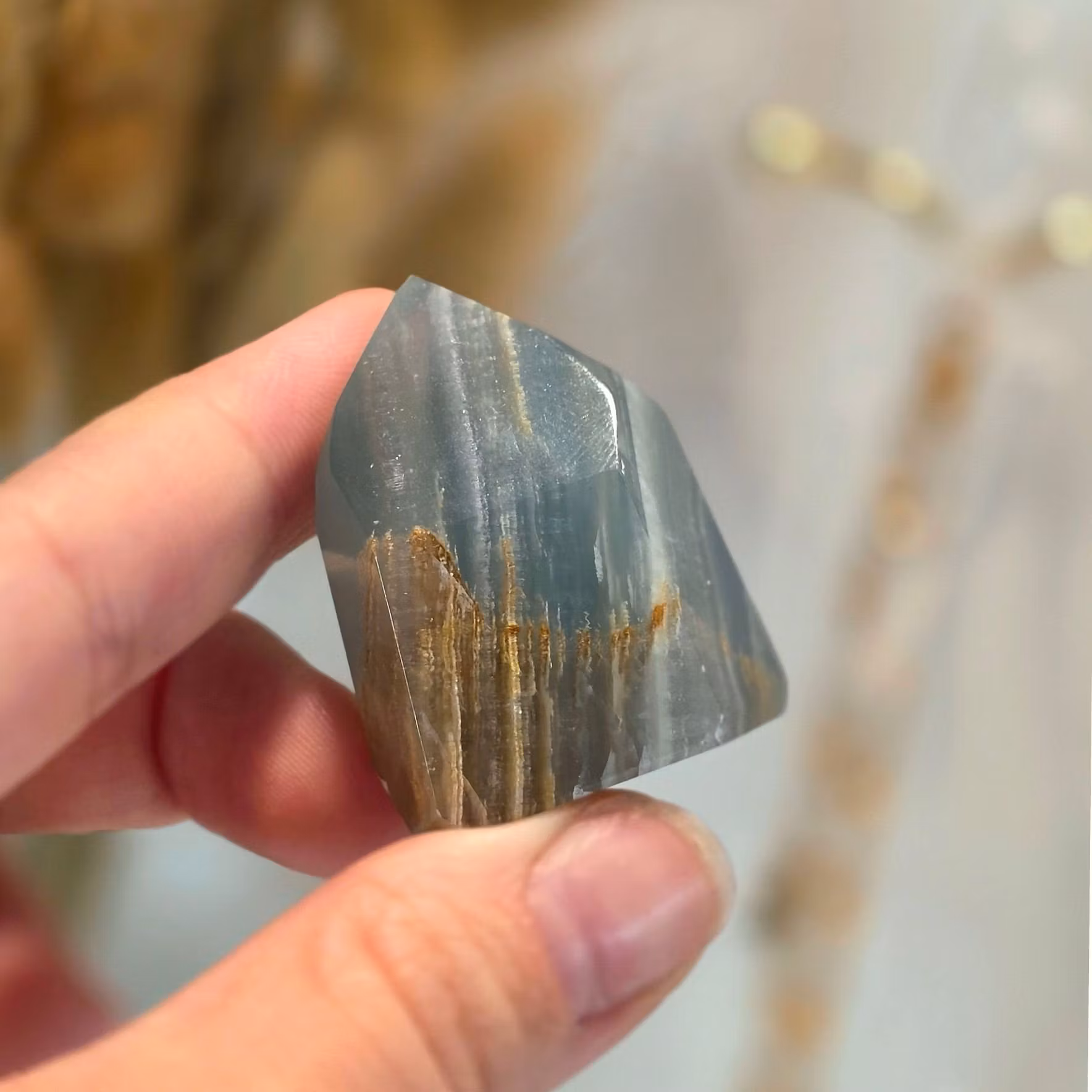 Blå onyx förknippas med lugn, fokus och inre stabilitet. Den sägs dämpa stress, stärka självdisciplin och hjälpa bäraren att uttrycka sig tydligt och ärligt. Stenen kopplas ofta till halschakrat och används för att främja klar kommunikation och mental balans.