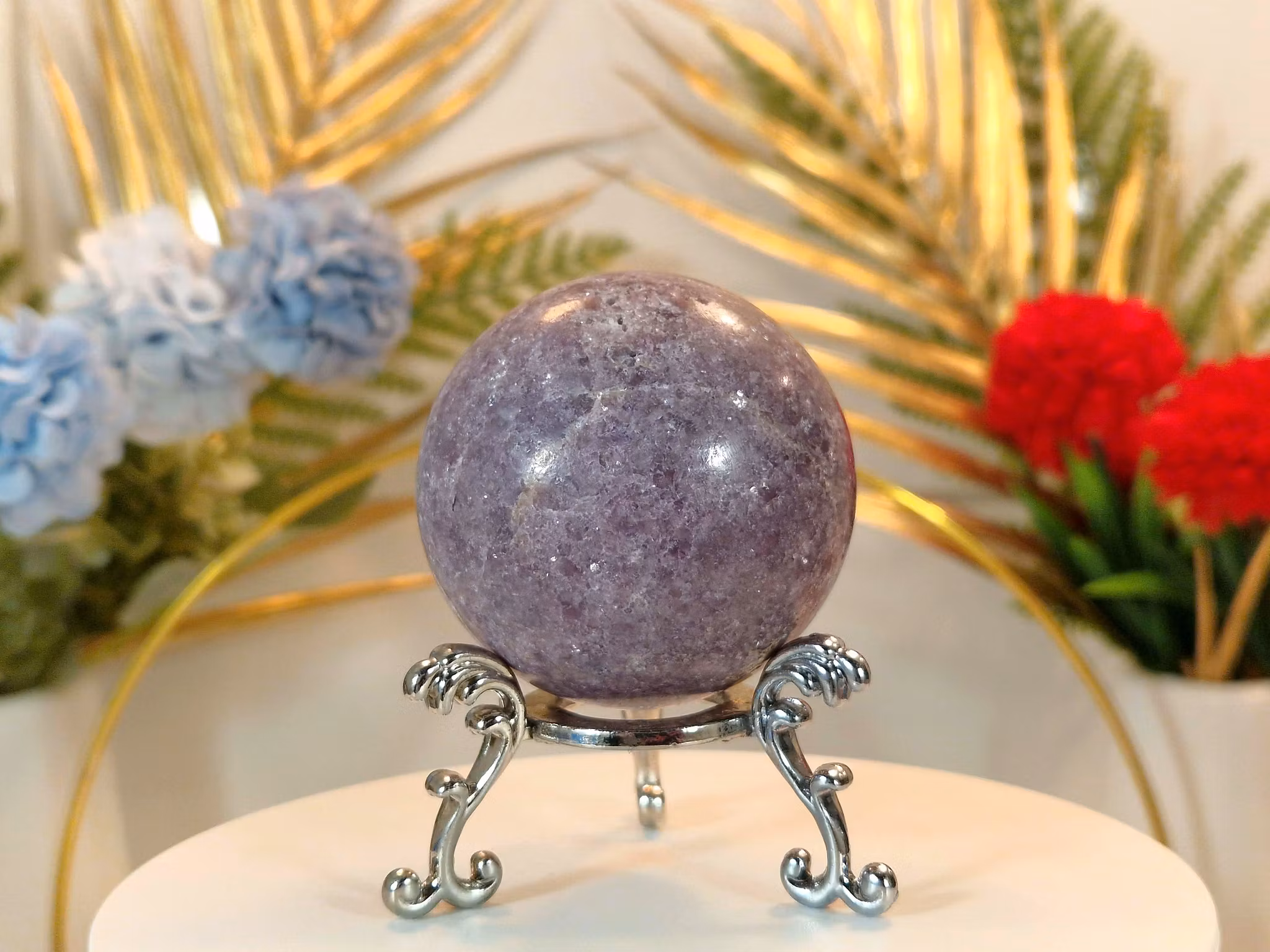 Detta vackra lepidolitklot med naturligt kluster kombinerar mjuk energi med kristallens naturliga skönhet. Lepidolit är känd som stenen för lugn och känslomässig balans , den hjälper dig att släppa stress, oro och gamla mönster för att ge plats åt ro och harmoni.