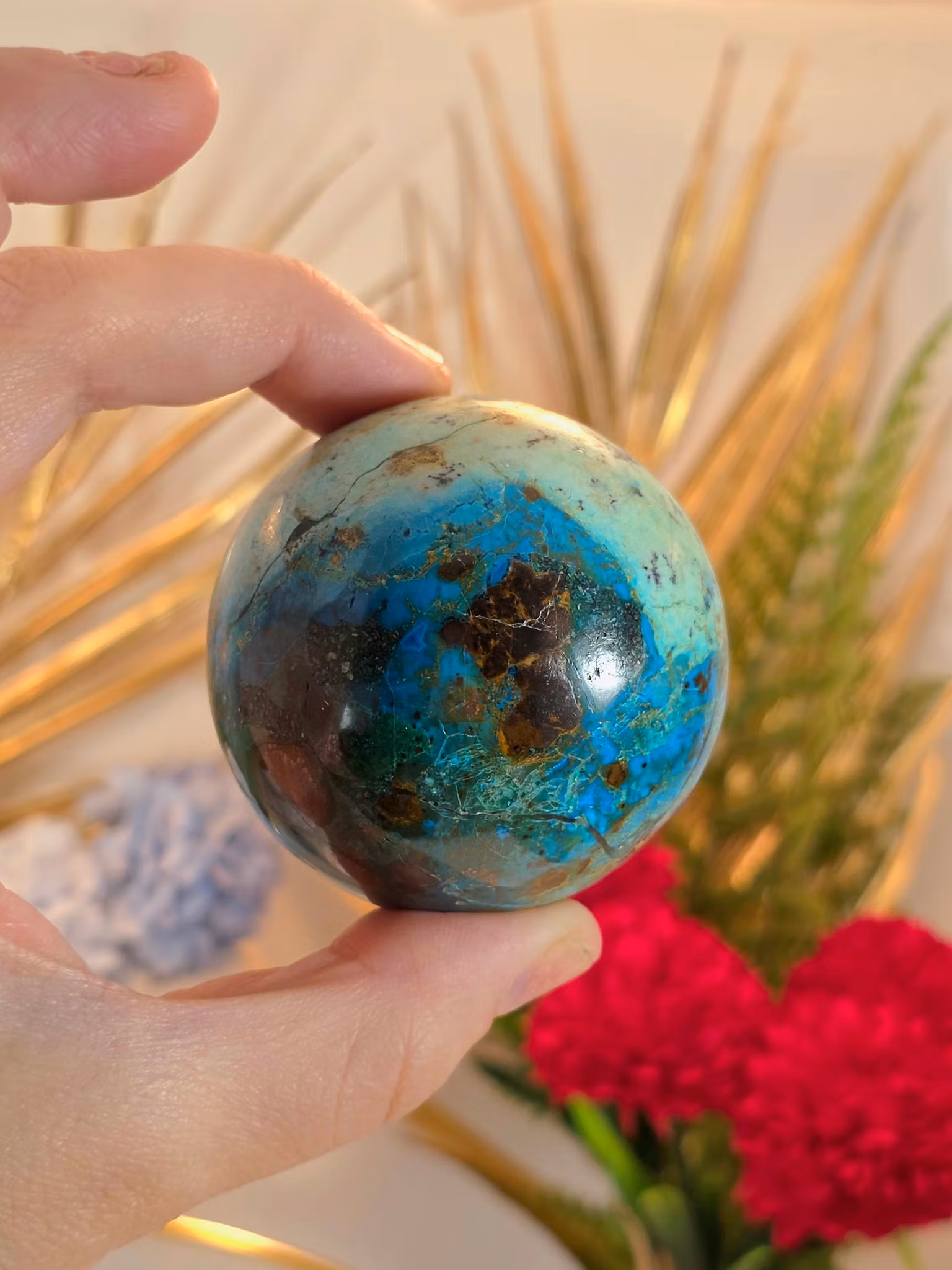 Fint klot av Krysokolla i otroligt hög kvalitét. Klotet ser ut som ett litet jordklot med fantastiska färger.