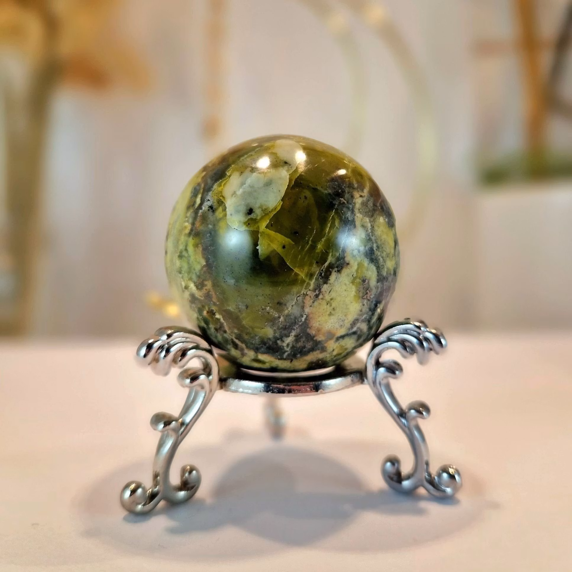 Klot Grön Serpentin 116 gram 299 kr I lager. Lägg i korgen Produktbeskrivning Ett fint grönt klot av Serpentin Vikt: 116 gramUrsprung: Peru