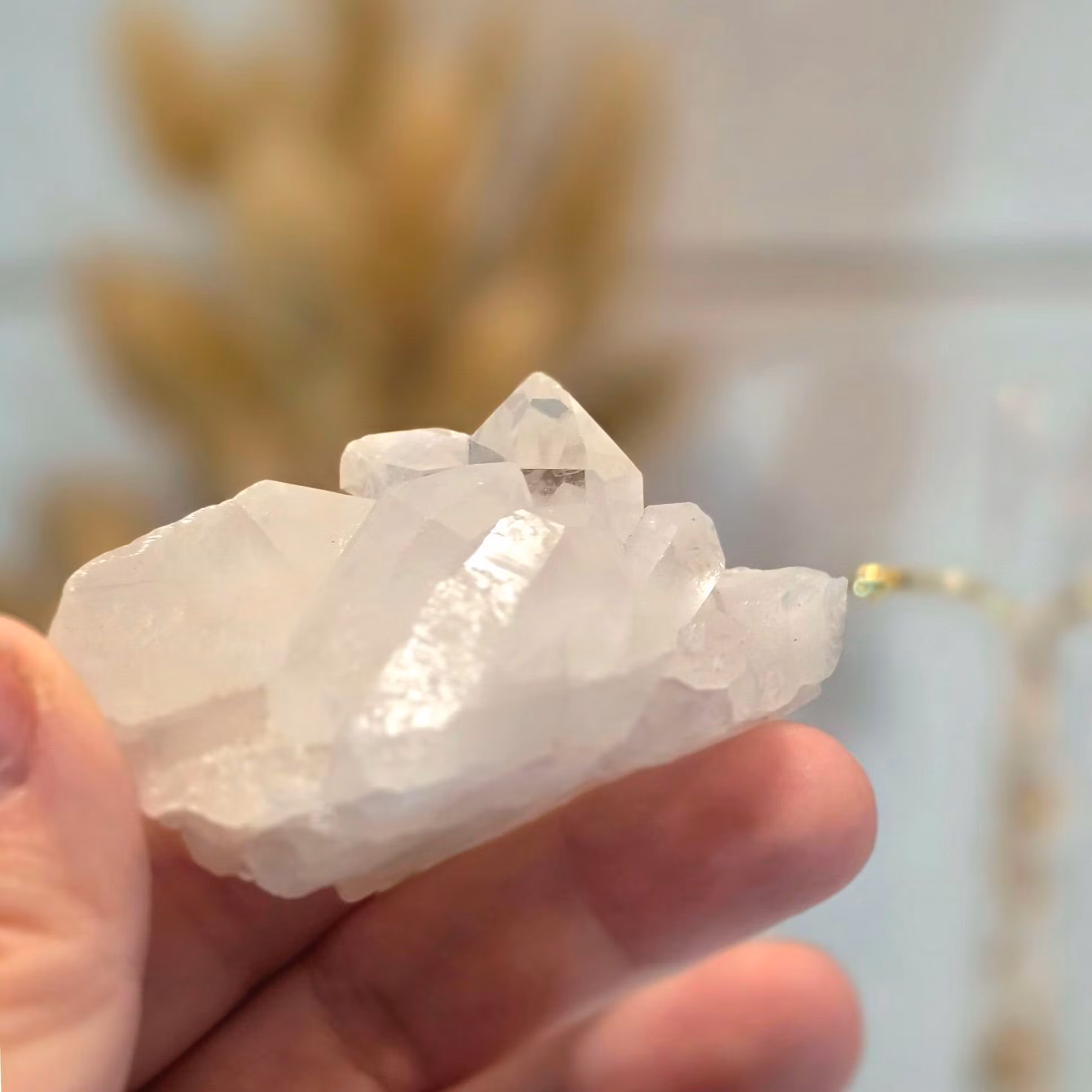 Detta naturliga kluster består av mjölkvit bergkristall, en mjukt opak variant av kvarts som bildas när små gasbubblor och mineralpartiklar kapslas in under kristallens tillväxt. Resultatet är ett silkesmatt, drömskt sken och en stillsam närvaro.