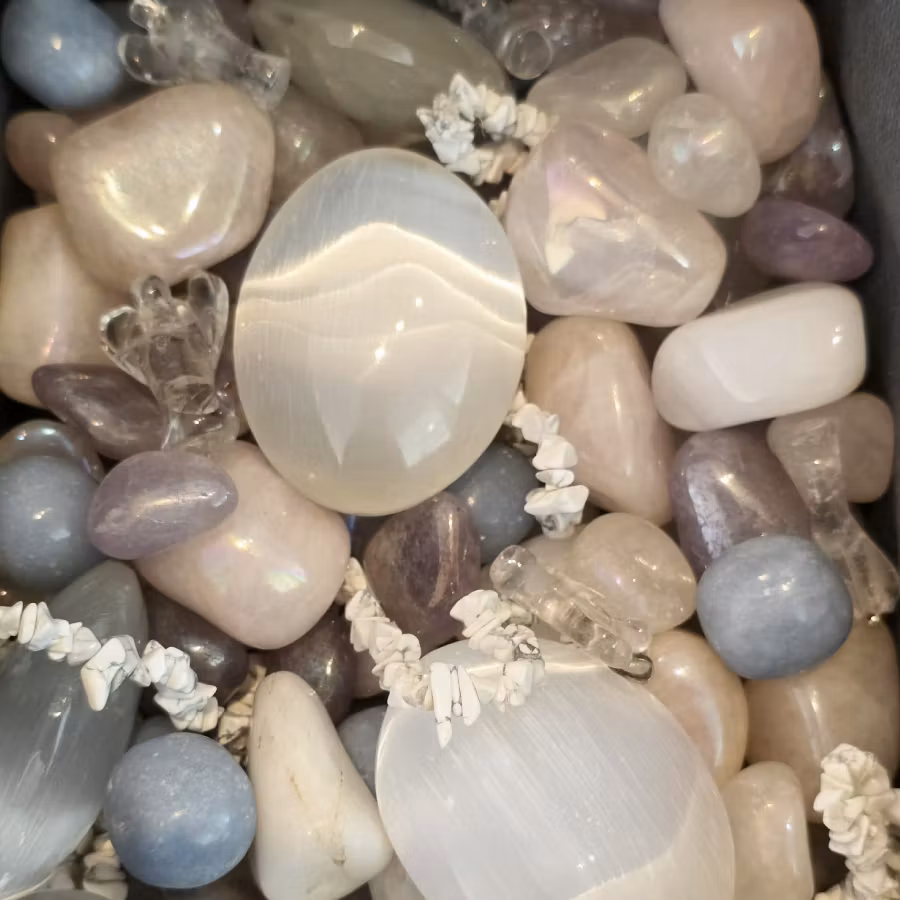 Selenit och Bergkristall står för klarhet och förstärker energin i de andra stenarna. Aqua Aura tillför en hög, ljus och upplyftande frekvens, medan Angelit och Rosenkvarts skapar mjukhet, trygghet och hjärtenergi.