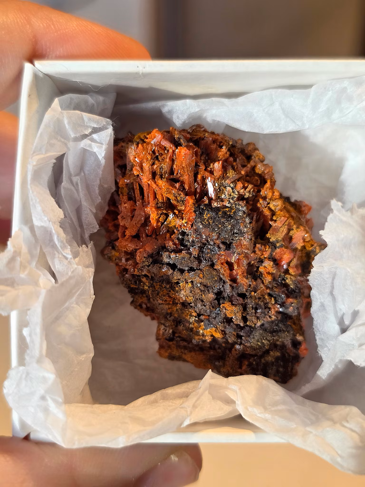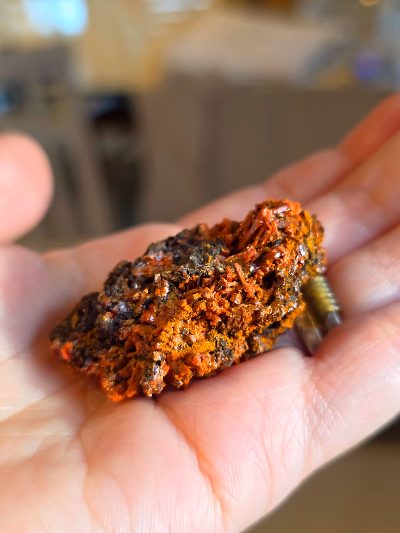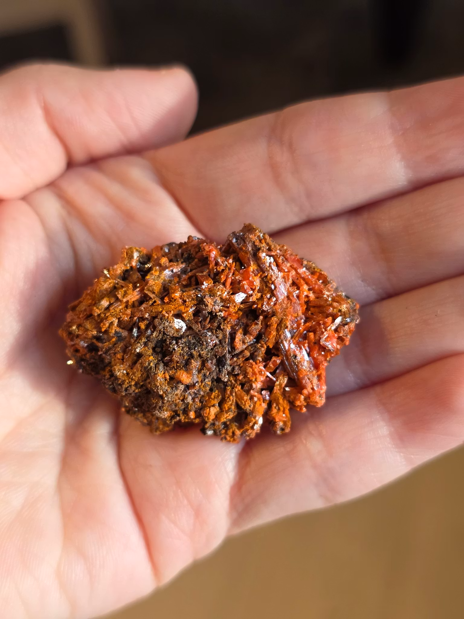 Krokoit är ett mycket sällsynt och mycket iögonfallande mineral som är känt för sin intensiva röd-orange färg. Den består av bly och kromat (blykromat) och bildar ofta långa, prismatiska kristaller som nästan ser glödande ut. Just färgen gör att krokoit ofta misstas för att vara ”för vacker för att vara naturlig”, men den är helt och hållet ett naturfenomen.