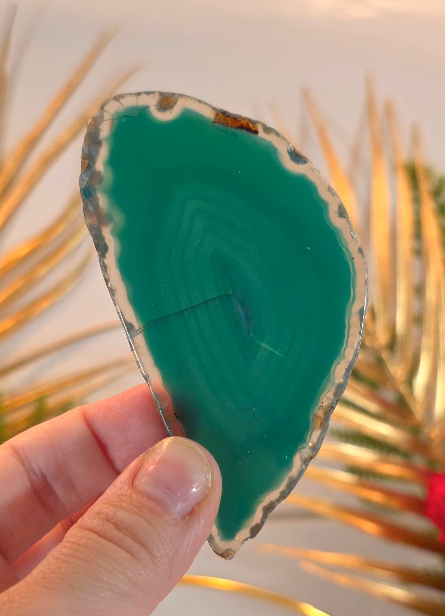 Varje agatplatta är unik, med naturliga mönster som formats av naturen under miljontals år. Den polerade ytan framhäver stenens levande ådringar, medan den råa kanten bevarar dess naturliga karaktär.