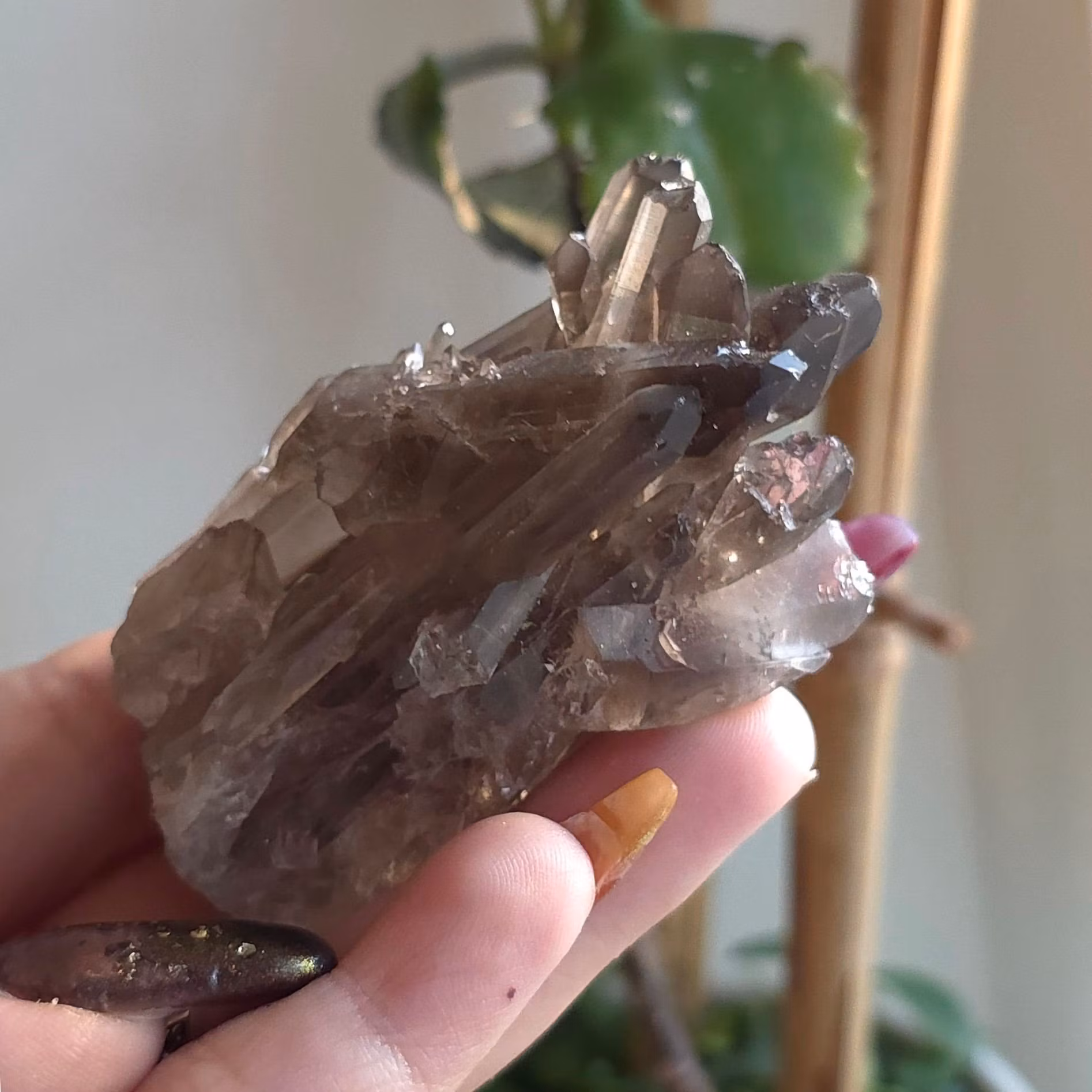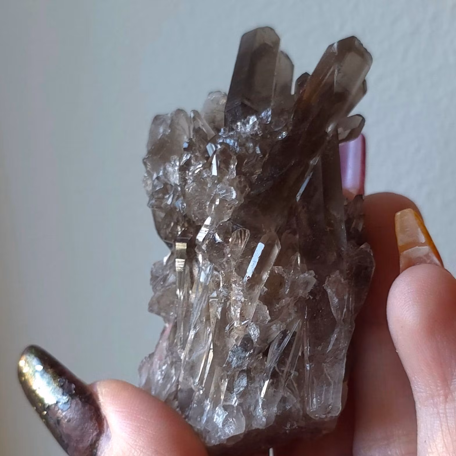 Rökkvarts Kluster 60 gram 169 kr I lager. Lägg i korgen Produktbeskrivning Rökkvartskluster. Fina mörka spetsar.Vikt: 60 grUrsprung: BrasilienDu får spetsen på bilden.