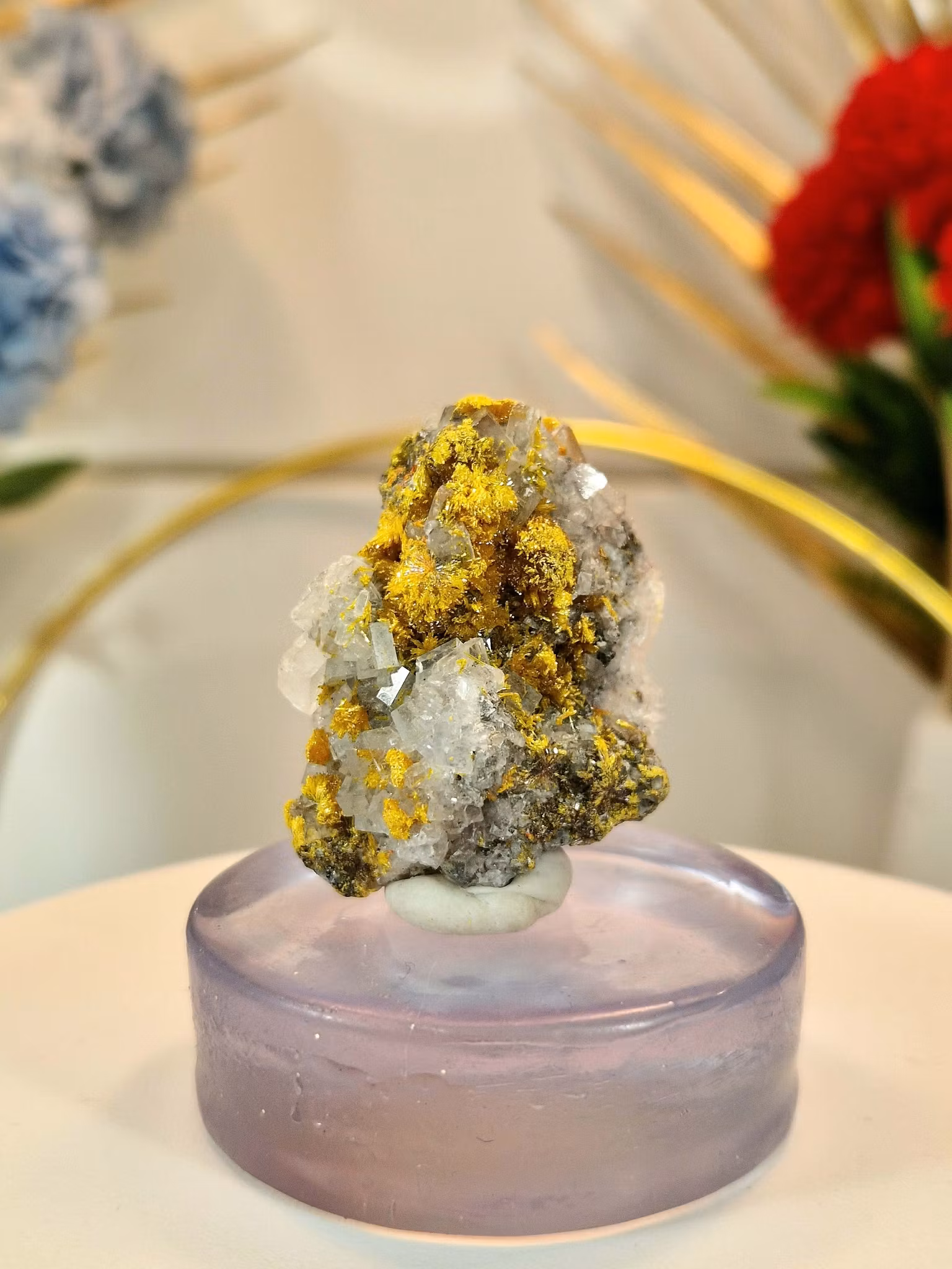 Realgar ger en diskret rödorange ton, orpiment skapar en gul, guldig glans, och baryt bidrar med neutrala vita kristallflak som harmoniserar färgerna. Tillsammans bildar de ett fint färgspel!