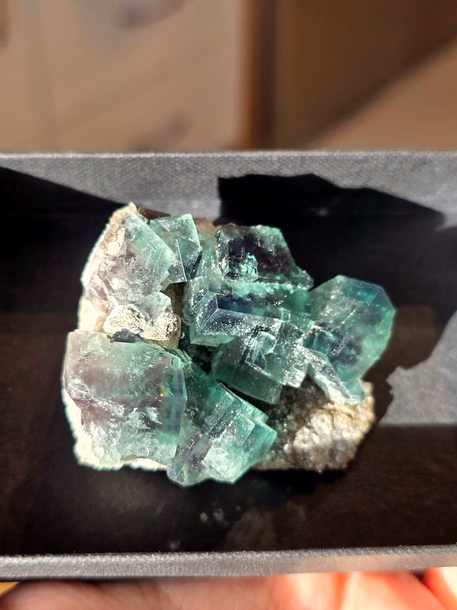Denna fluoritskatt kommer från den relativt nyupptäckta “Naughty Gnome Pocket” i Diana Maria gruvan i Weardale, County Durham, England, en del av det klassiska Rogerley Quarry-området som är mycket uppskattat bland samlare världen över för sin fluorescerande och färgskiftande fluorit.