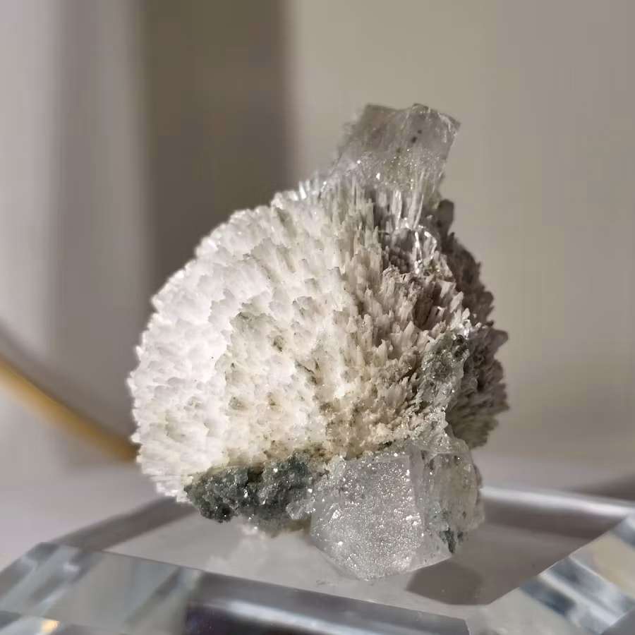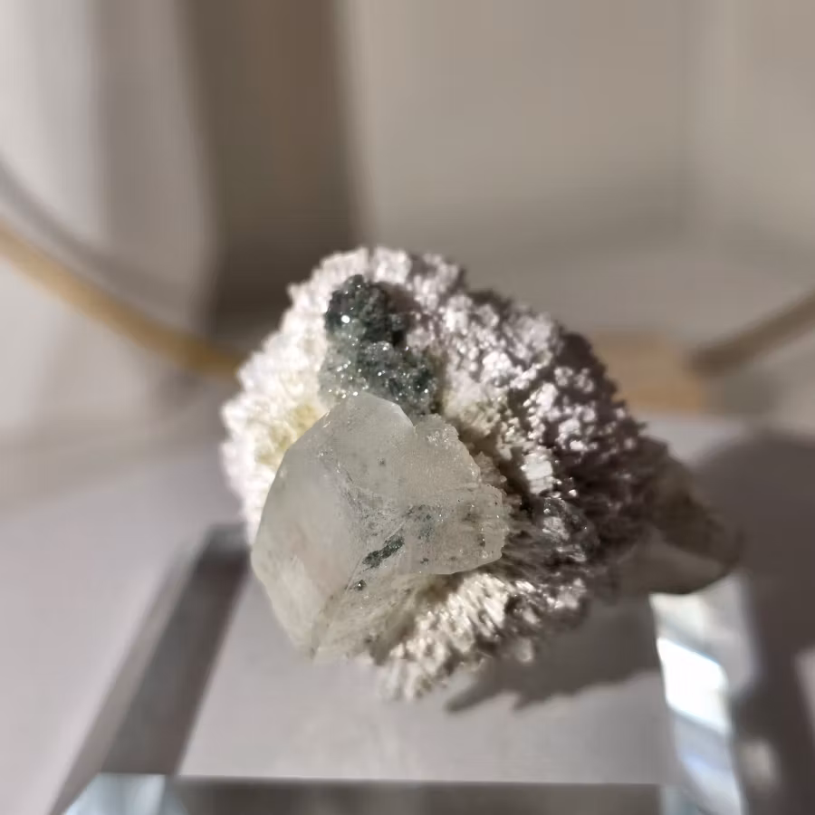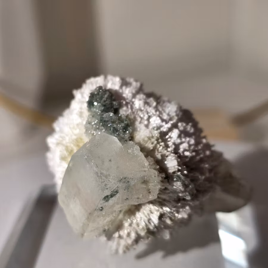 Thomsoniten bildar subtila, strukturerade sfärer / bollar, som kontrasterar mot den gröna apofylliten, vilket skapar ett estetiskt och naturligt mineralexemplar, helt klart utöver det vanliga!