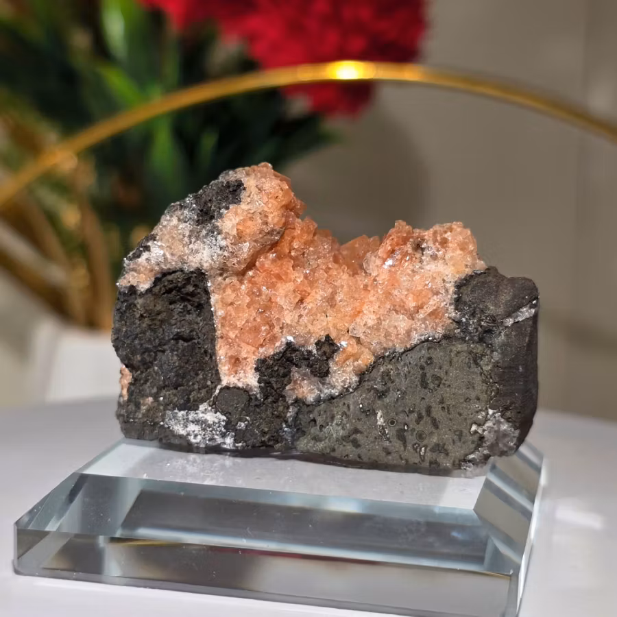 Exemplar från Madhya Pradesh, Indien har ofta en varm aprikos–orange ton och sitter naturligt på mörk basaltmatrix, vilket ger en vacker kontrast och framhäver kristallernas tydliga form.