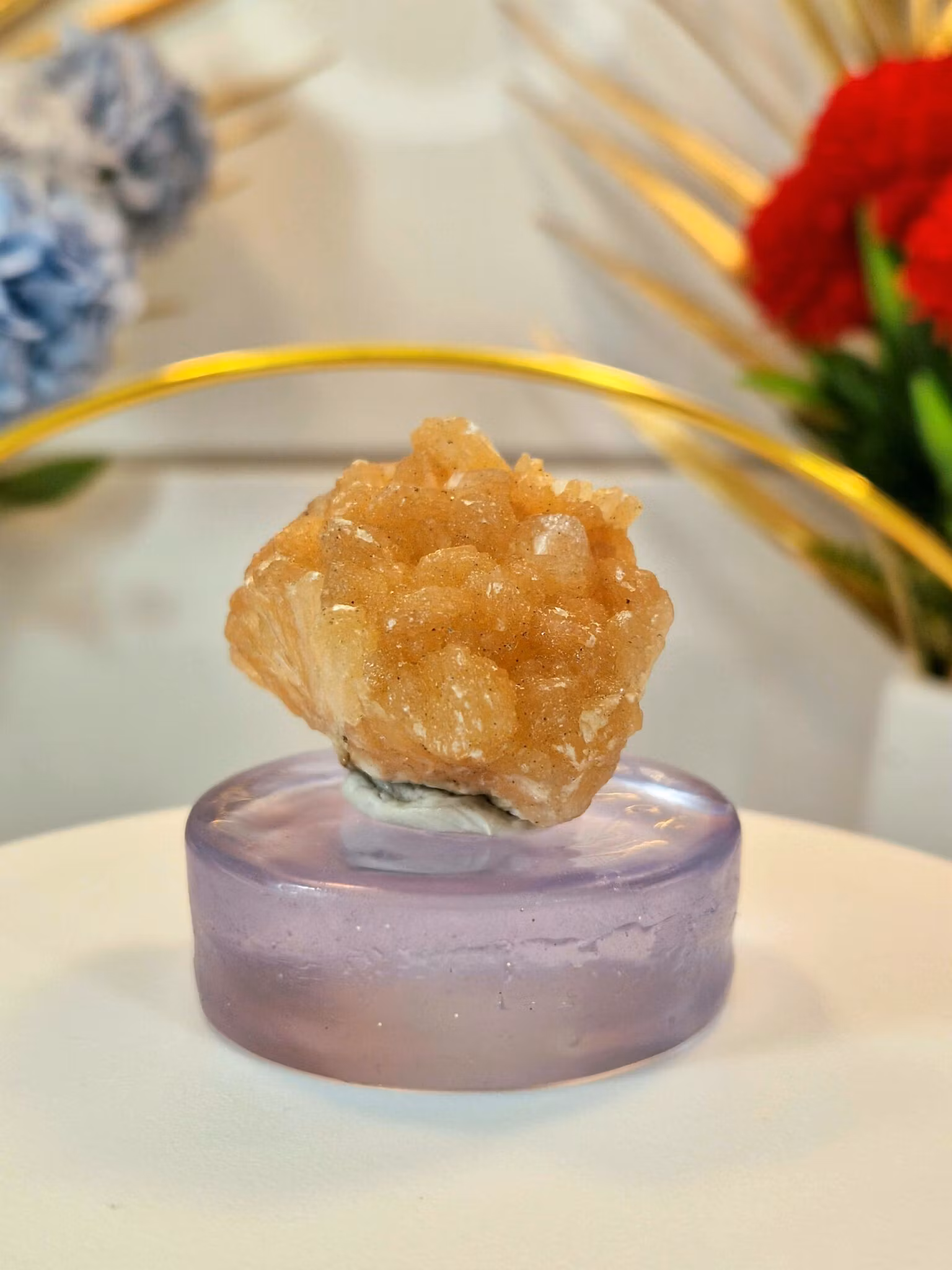 Denna lilla stilbit i varm orange ton är ett naturligt zeolitmineral från Maharashtra‑regionen i västra Indien.