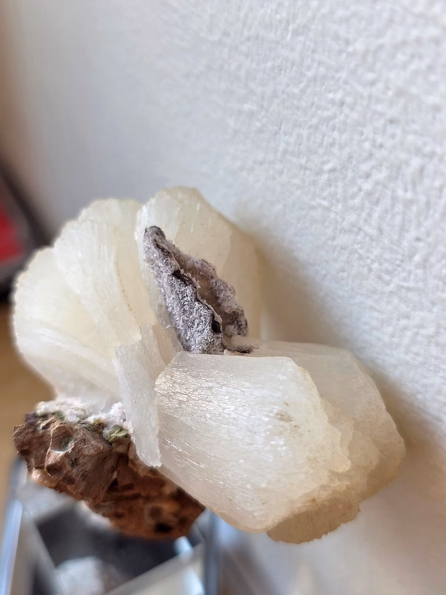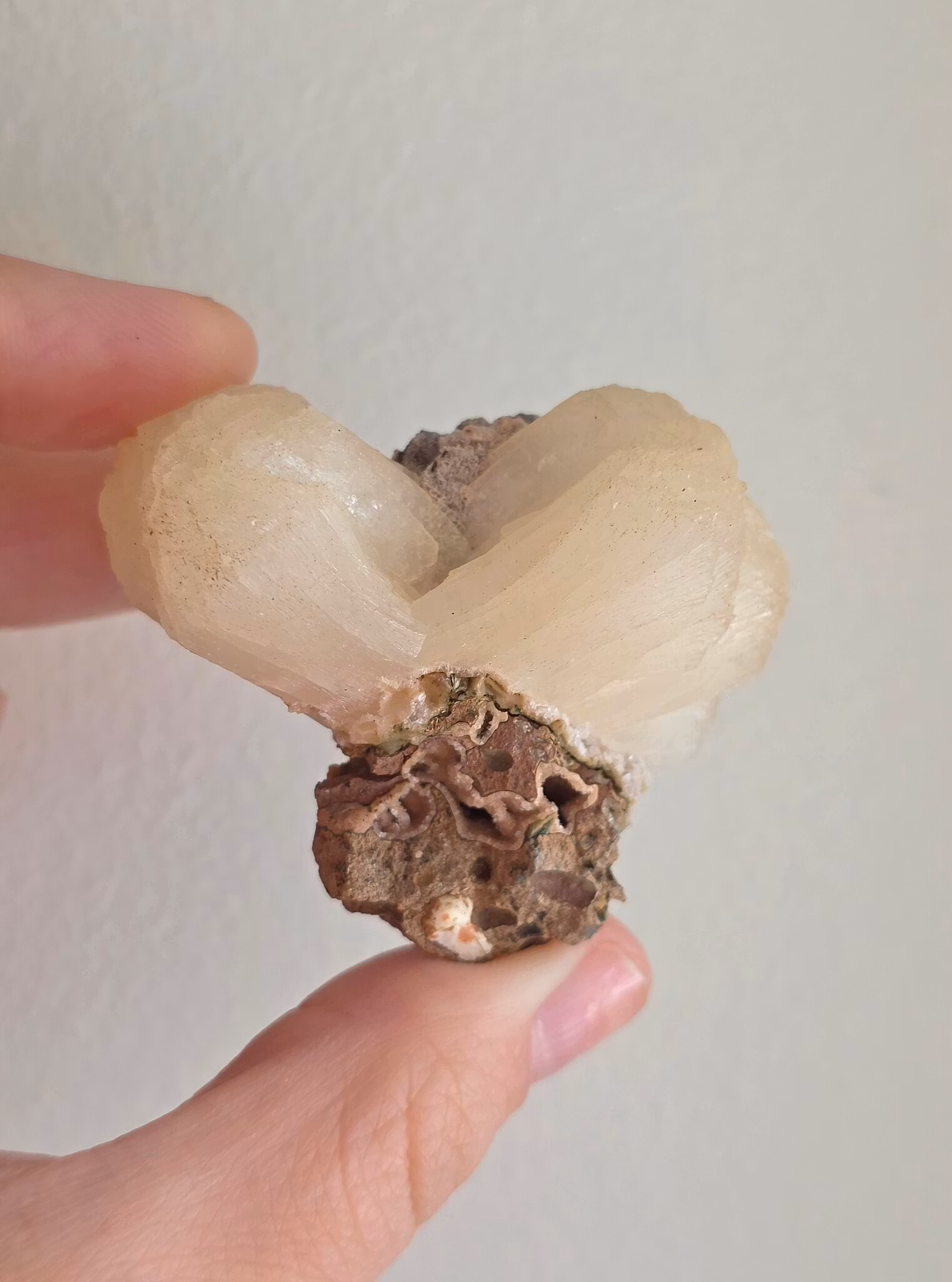 Stilbit är i sig inte ett allt för ovanligt mineral i Indien, däremot är formationen och uttrycket på just denna ovanligare. Den är formad som en klassisk fluga (bow tie), bägge sidor är fint formade i liknande storlek. Den sitter på en otroligt häftig bas med druzy små öppningar som blänker. Även ovanpå sitter det som en sockrig yta med kristall-liknande mineral. Själva "flugan" är mjukt persikofärgad, och druzyt i matrixen är desto mer färgad.
