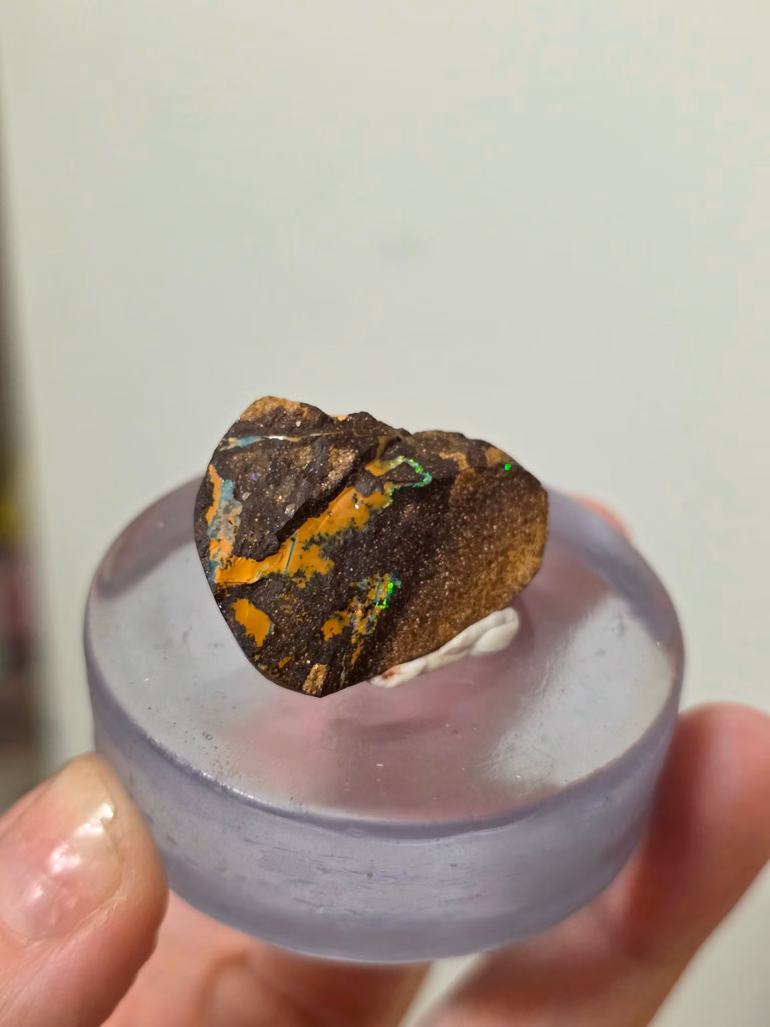 En fantastisk boulder opal från Koroit i Queensland, Australien, ett av världens mest eftertraktade områden för just denna typ av opal. Denna opal har inslag av grönt och blått och man kan även skymta rött.