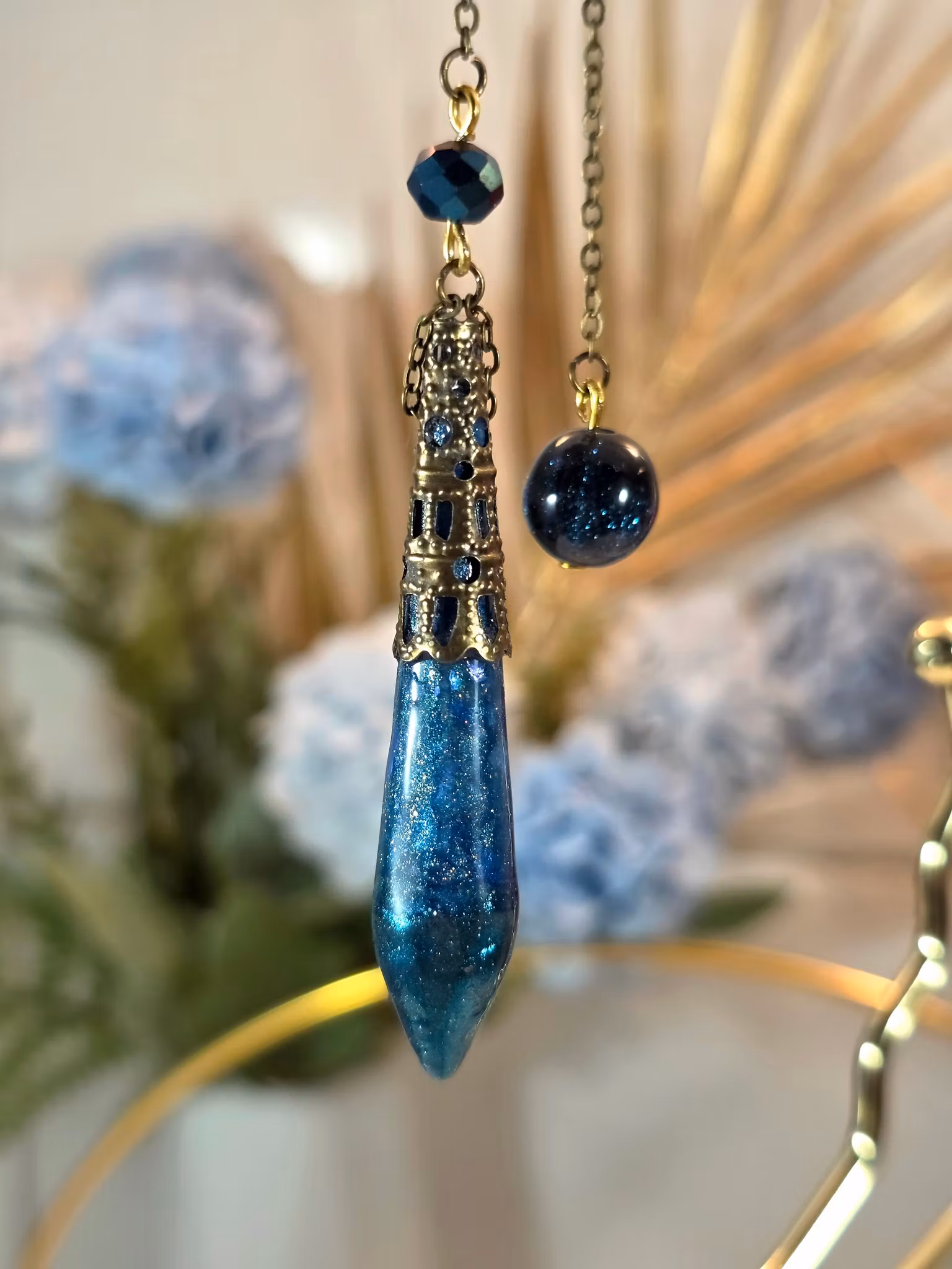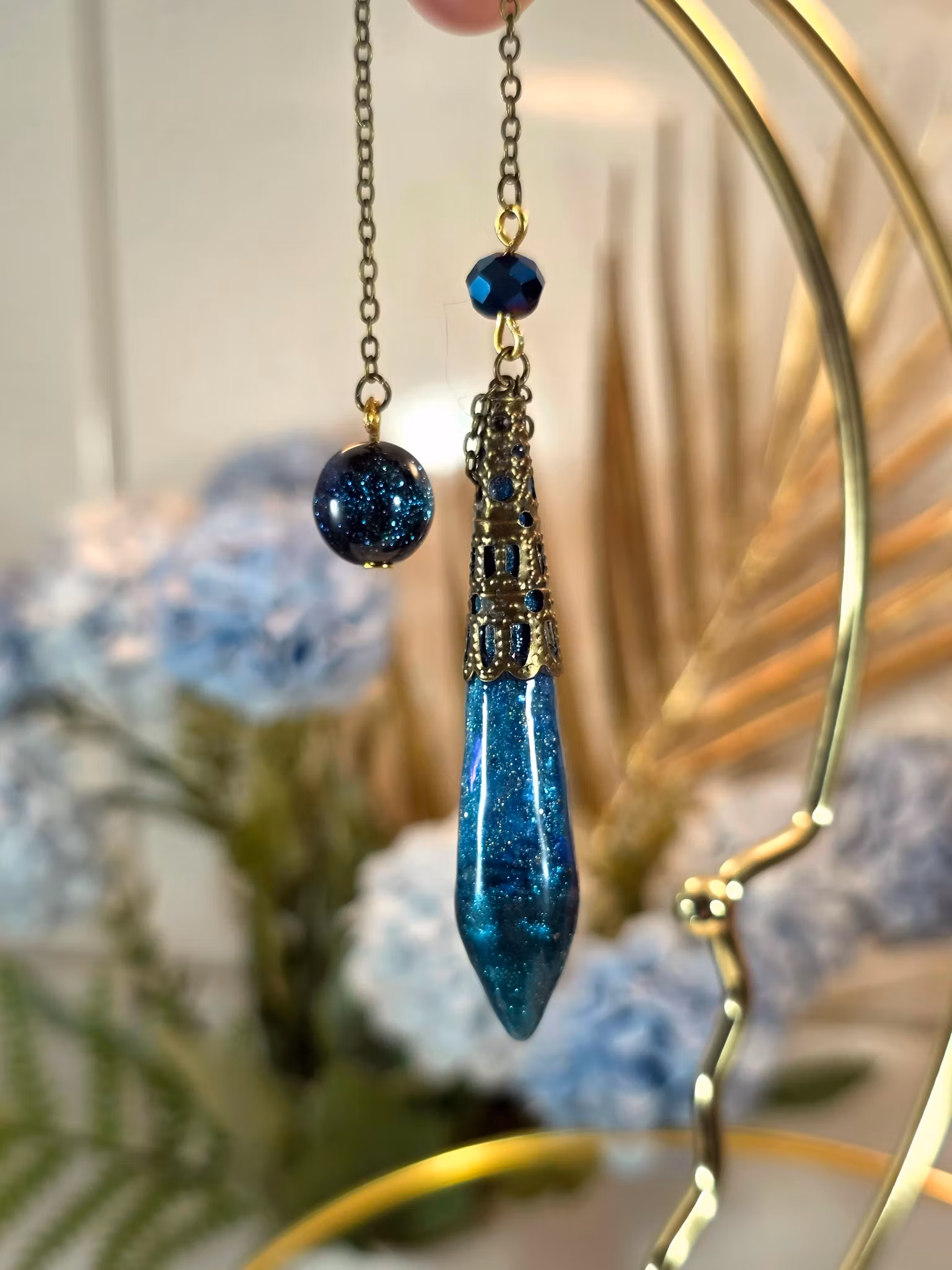 Handgjord Pendel Petrolblå Grön 99 kr I lager. Lägg i korgen Produktbeskrivning Handgjort pendel av Henriettes Magiska Ting i fina glimmande färger i petrolblå och grönt.Gjord av resin med holografisk effekt, med glittrande pärlor.