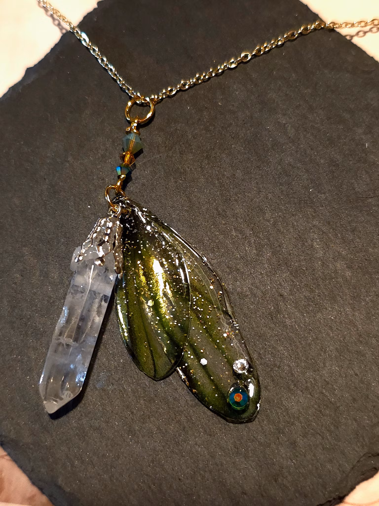 Fantastiskt hängande halsband bestående av två älv-vingar i en grön ton. De är har en blandning av glitter och strass, och en kristall i aurakvarts hänger längst ned.