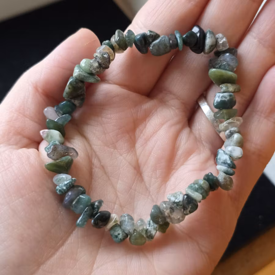 Mossagat är en mjuk och jordnära sten med ett väldigt levande uttryck, där de gröna, mossliknande mönstren ofta påminner om små landskap inuti kristallen.