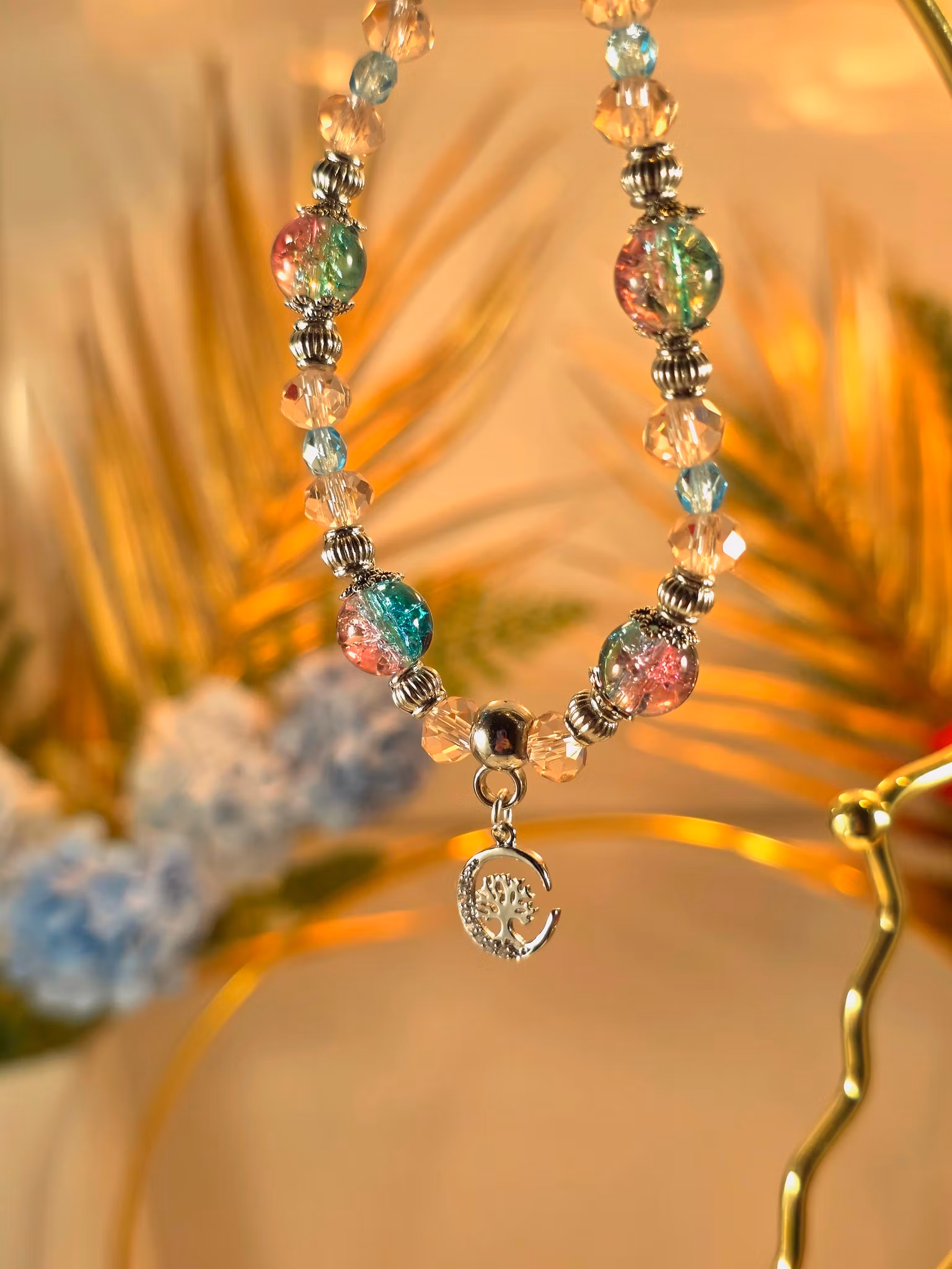 Går i grönt och blått med guldiga detaljer, med en fin guldig berlock med Livets träd.