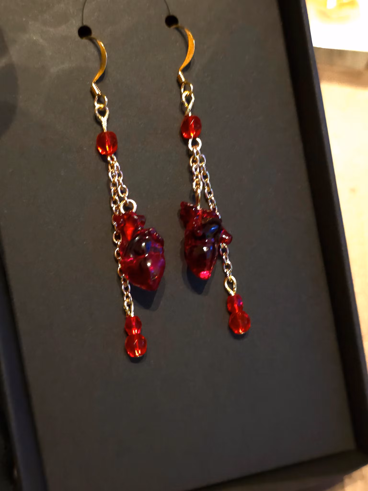 Anatomiskt rött hjärta med guldfärgad kedja med röda pärlor. Väldigt coolt, nästan som bloddroppar.