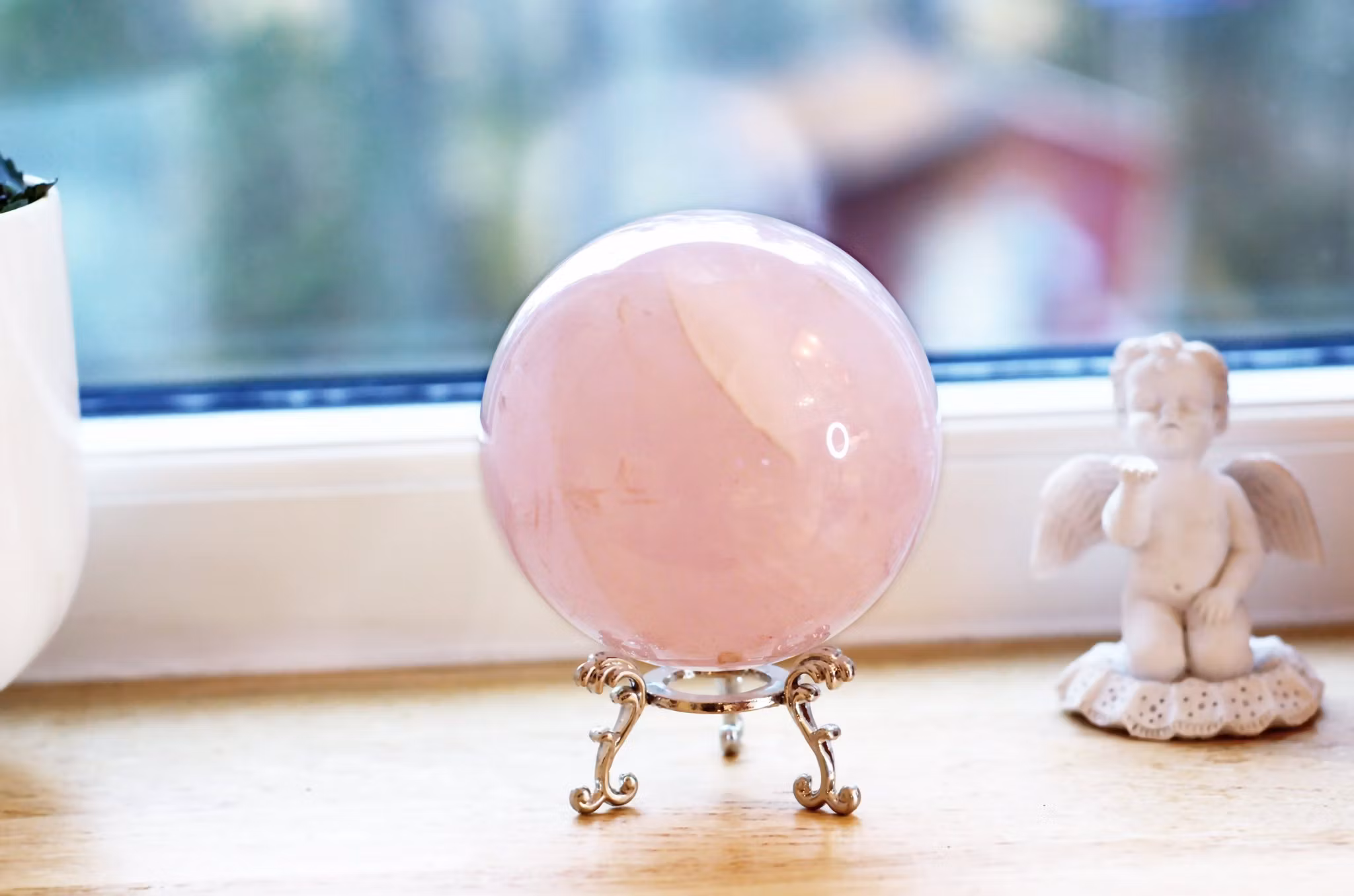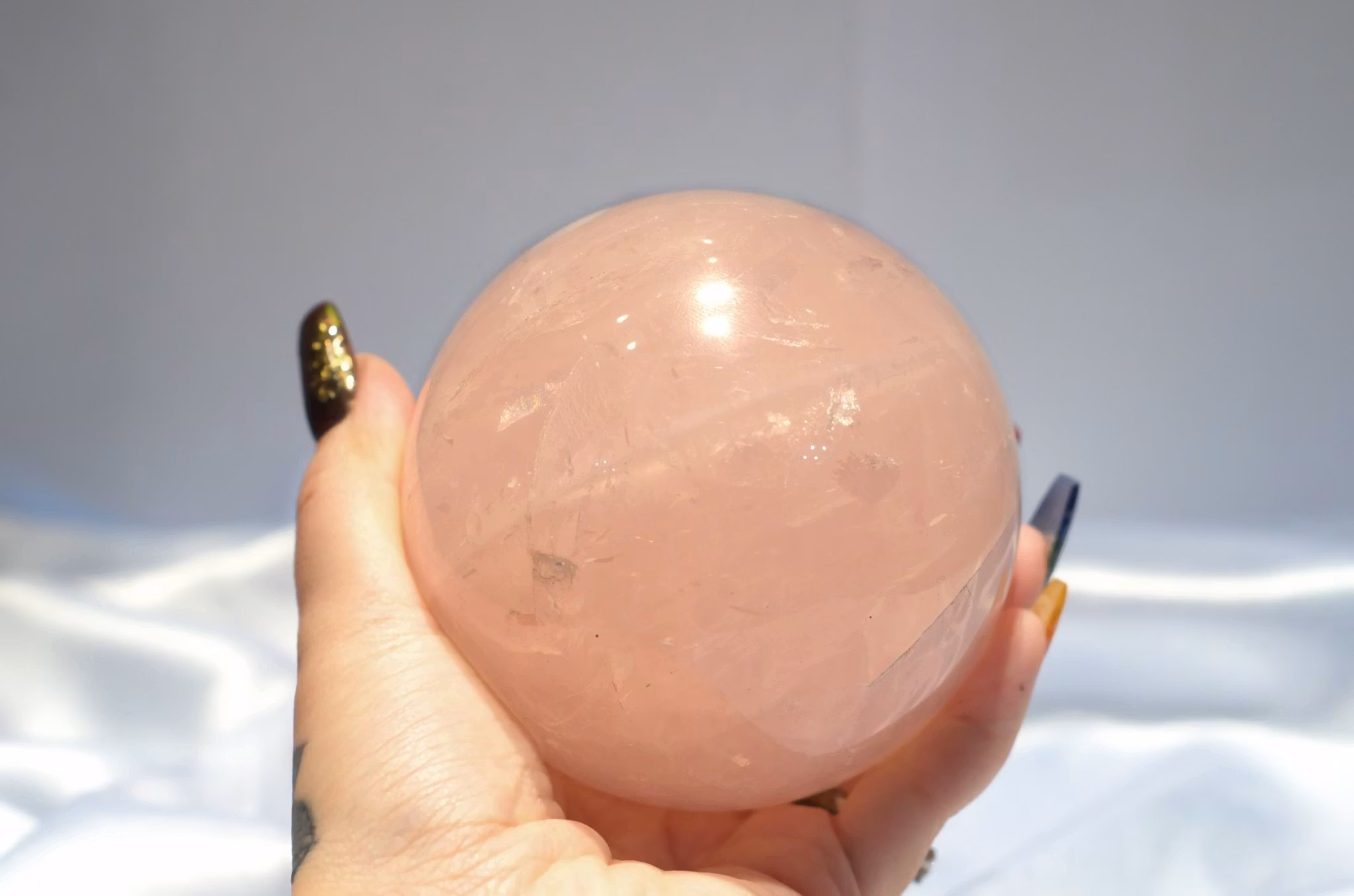 Ett kraftfullt och harmoniskt rosenkvartsklot med vacker, mjuk rosa ton och naturliga inre strukturer som ger djup och karaktär. I ljus fångar den subtila regnbågsreflexer, vilket tillför ett mjukt, eteriskt skimmer.